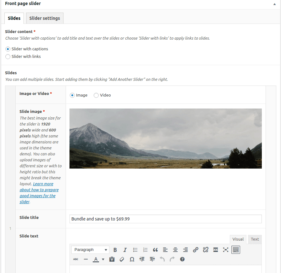 - Recommended dimensions for slider images are 1920 x 600 px, but it will also accept images of different ratio and adapt accordingly.