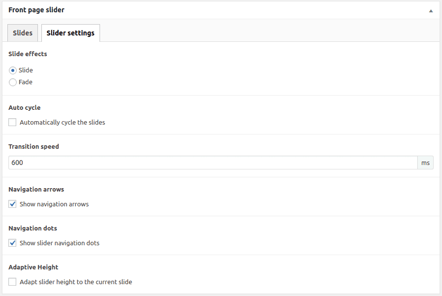 - The slider settings can be folded so once the slider is configured it doesn’t take up space for editing of the rest of the page.